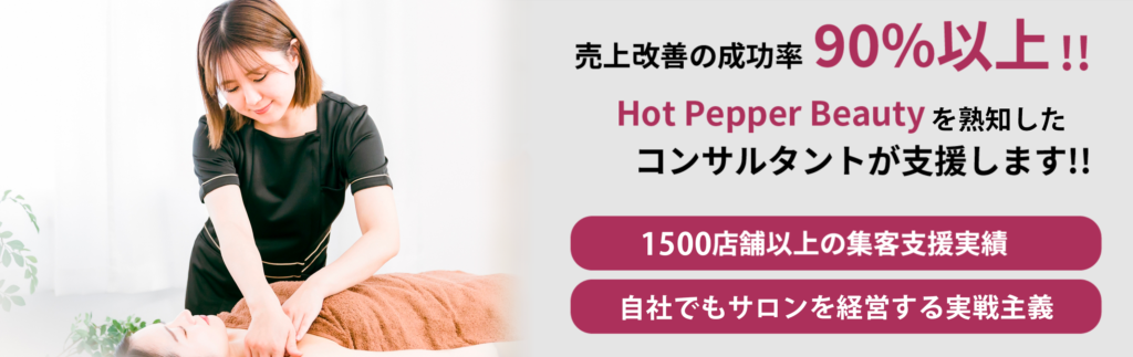ホットペッパービューティーに精通した専門スタッフが、 美容サロン様に特化して行う実践型の集客サポートサービスです。 元リクルートのホットペッパービューティー営業経験者が、 戦略立案からページ編集まで一貫して対応いたします。 単なるアドバイスに留まらず、 実際のページ編集・改善作業まで代行するのが特徴です。